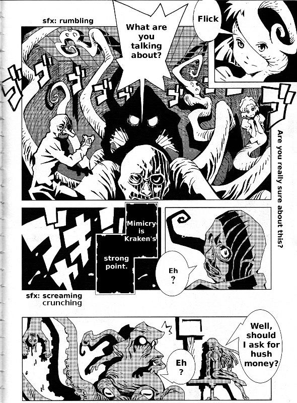 In the American Area 51, there is a society where many varied supernatural creatures-kappa, vampires, aliens, gods and goddesses of various mythologies, mythological figures (like King Arthur), and more-make their home. In addition to the non-humans, there's also a population of humans, people who can't live in the ordinary world for one reason or another. One of these people is Magoi Tokuko, commonly known as McCoy, a tough woman who works cases with the help of her kappa associate, her deep knowledge of the area, and her pistol. In her office, which she's built in an unfinished subway station, she takes on all kinds of jobs (recovery of stolen goods, infiltration, etc.) from the many humans and non-humans who come to pay for her help. (Source: MangaHelpers)