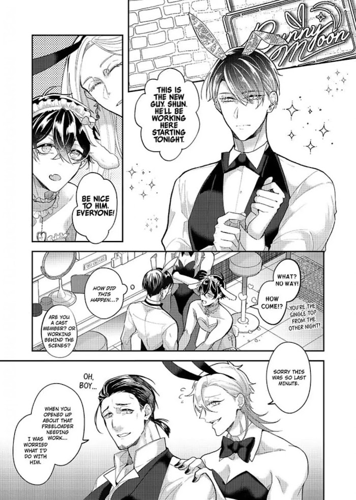 "I can't believe Hibiki's on stage in that naughty outfit..." Hibiki works as a bunny boy in a night club where he's reunited with Shun, a classmate from college he secretly had feelings for. Giddy with joy, he drinks himself silly as they reminisce over their time together and before he knows it... Shun follows him into the bathroom and makes a move on him!? A scuzzy love addict and a meddlesome pure-hearted bunny boy! This is the love story of two men reunited over alcohol, cigarettes, and their memories from college.