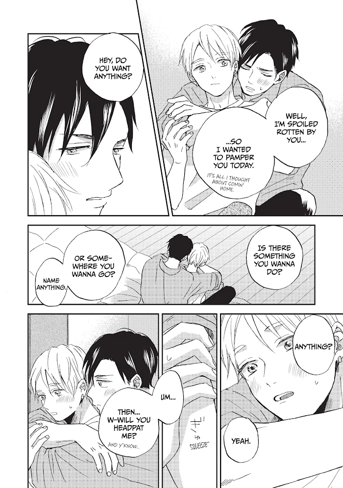 "Hey, should I provide you therapy?" Tired of love and on the verge of turning into a workaholic, Sakuraba Kiichi, finds himself waking up in a bar he visited on his way back from a close friend's wedding ceremony. There, he meets reckless and good-looking university student, Kijima Nao--? They exchange promises to hug just once a week. What is this, so gentle, so warm, with a faint pleasant smell... Being strung along by the younger Nao, who has his own circumstances, what will happen to Kiichi--!?
