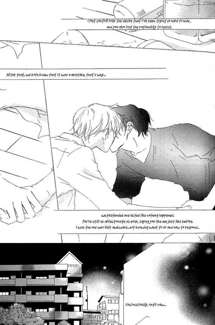 When Tomosaka realized he was in love with his best friend Noda, it seemed the most natural thing in the world. He couldn't even remember when he'd first started falling in love. He had his feelings, but he couldn't express them... because Noda was his best friend. A story about the delicate thread that separates friendship and love. (Source: June)