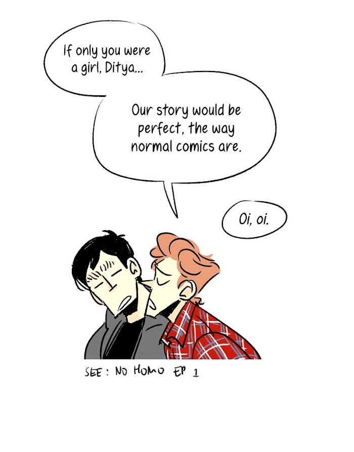 No Homo manga summary: Brian and Ditya super intimate friendship makes everyone suspicious! They go everywhere together, share the same boarding house, go to the same university, like to take a selfie together... they really are friends, right? Woops, no homo! ***Disclaimer: This webtoon contains jokes regarding sexual orientation stereotype in author's surroundings. The contents expressed in this webtoon are not intended to offend anyone and do not always reflect personal opinions of the author. Read it at your own risk.***